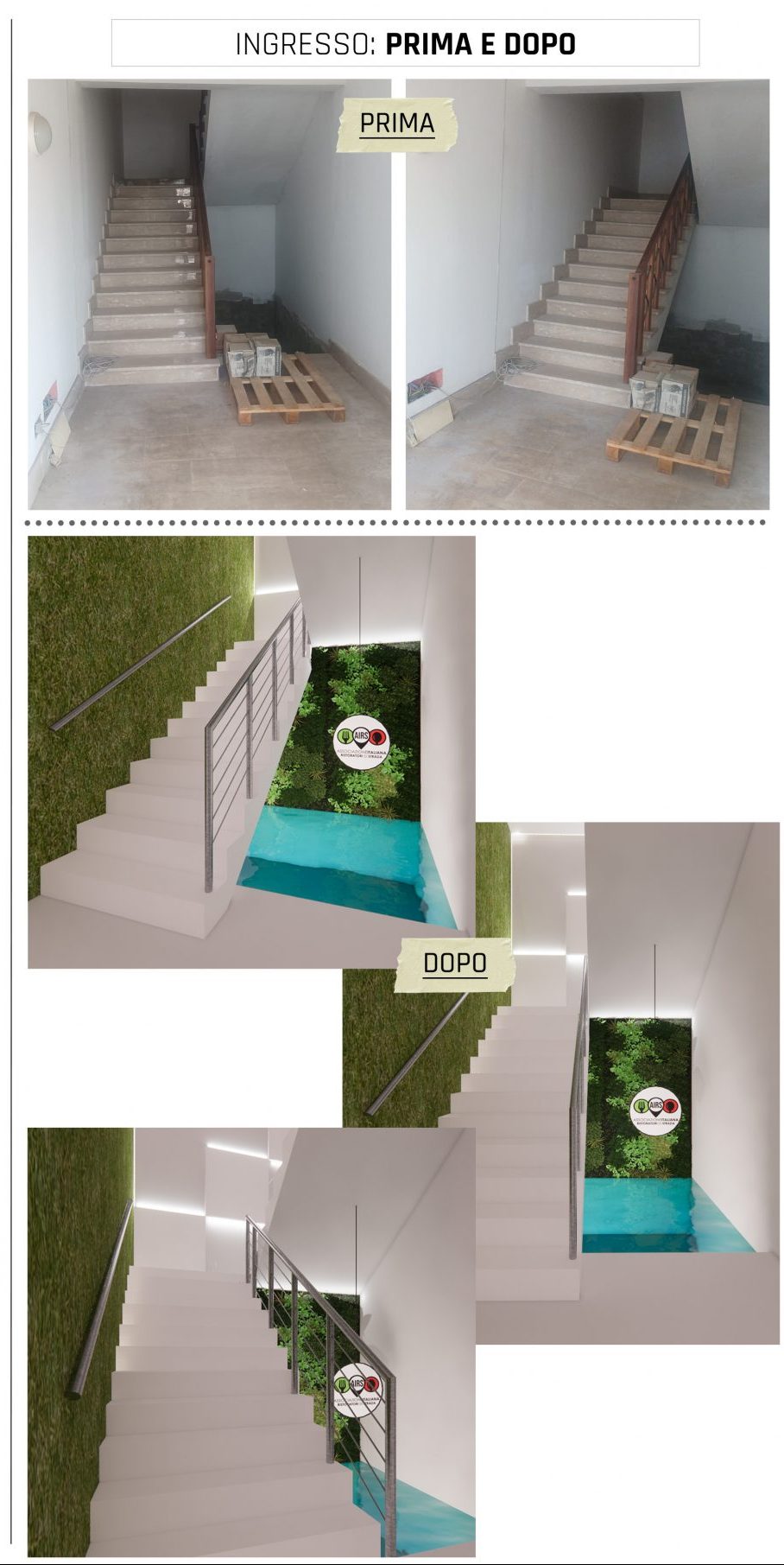 L’ accesso principale era posto al piano terra ed andava ovviamente risaltato. Pertanto, il primo approccio fu quello di unire il logo dell’associazione al luogo, concentrando il tutto nella scala d’ingresso al piano. Chi entrava doveva subito inquadrare dove si stava e dove dirigersi, dato che, lo stesso accesso portava anche ad altri spazi al piano terra. Il logo dell’Associazione era pensato per essere sospeso su un piccolo specchio d’acqua, contornato da del verde stabilizzato. In foto è evidente il prima e il dopo.