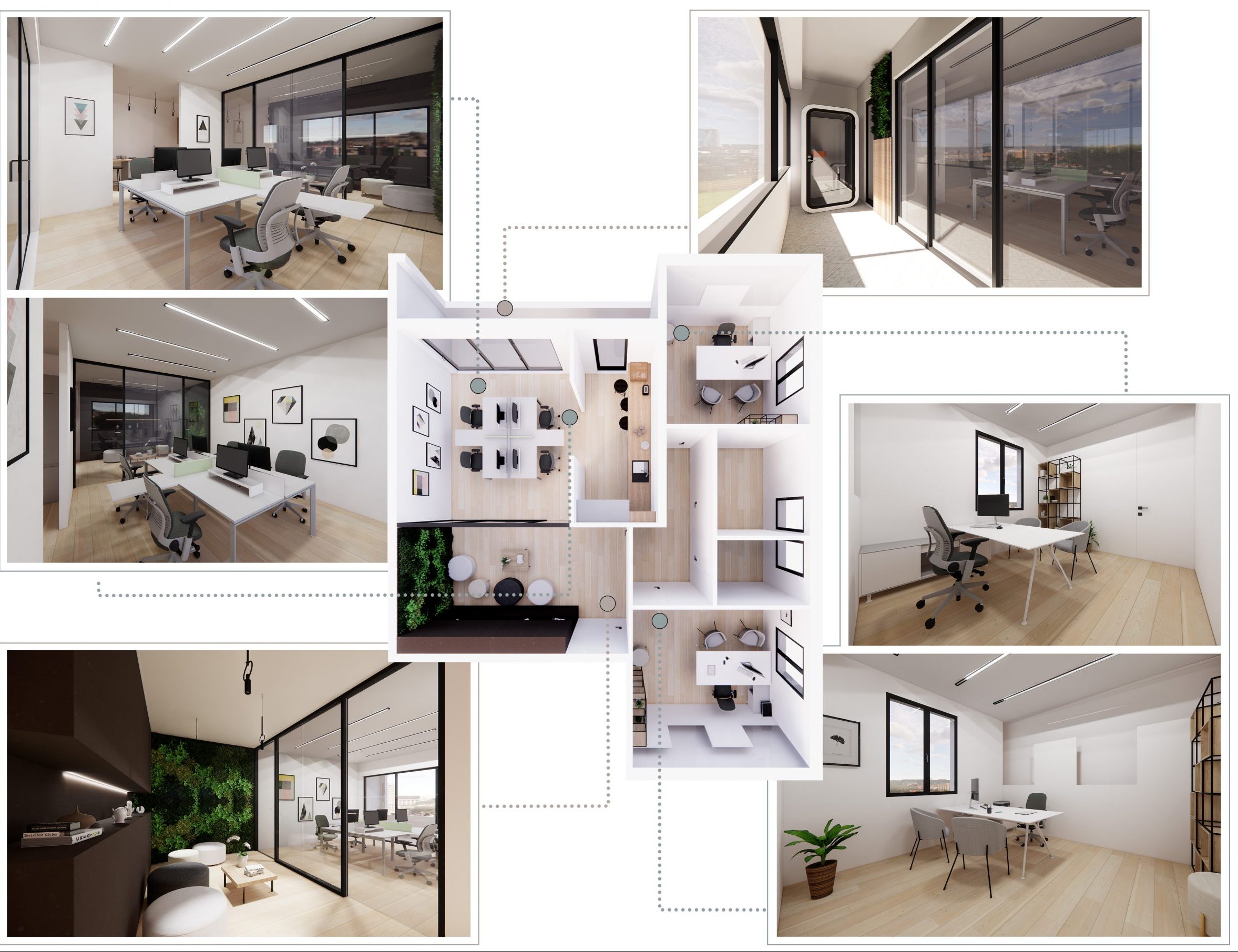 Le fasce d’illuminazione a led, evidenziavano la scala che portava al piano superiore, dove il discorso luci LED integrate a soffitto, continuava accompagnando il visitatore, od ospite, all’interno degli uffici. Una pre-sala accoglienza confinata da pareti attrezzate ad uso archivio, verde stabilizzato e divisorio in vetro, si sarebbe affiancata ad uno spazio lavoro condiviso con 4 postazioni. Da qui l’accesso poi verso la veranda adibita a zona relax con Phone Booth e area break. Sempre dalla sala attesa, si accedeva ai due uffici direttivi. L’intervento non avrebbe intaccato le partizioni esistenti, se non modificando gli ingressi e integrando divisori come appena descritto.